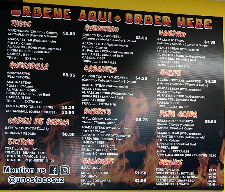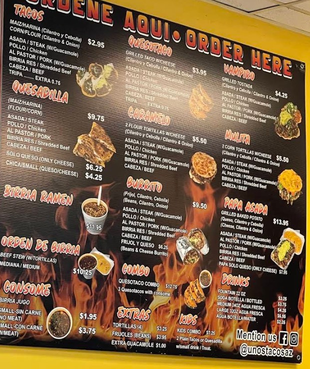 Welcome to the dedicated menu page for UNOS TACOS Y BIRRIA Restaurant! If you are searching for the most authentic and flavorful Birria in the area, you've found the right place. Our specialty is the rich, slow-cooked Birria de Res (beef), served in our crispy Tacos de Birria and savory Quesabirrias. Explore the complete UNOS TACOS Y BIRRIA Restaurant menu below to see all our classic tacos, delicious sides, and current prices. Dive into the flavor and place your order for a true taste of Mexican tradition!